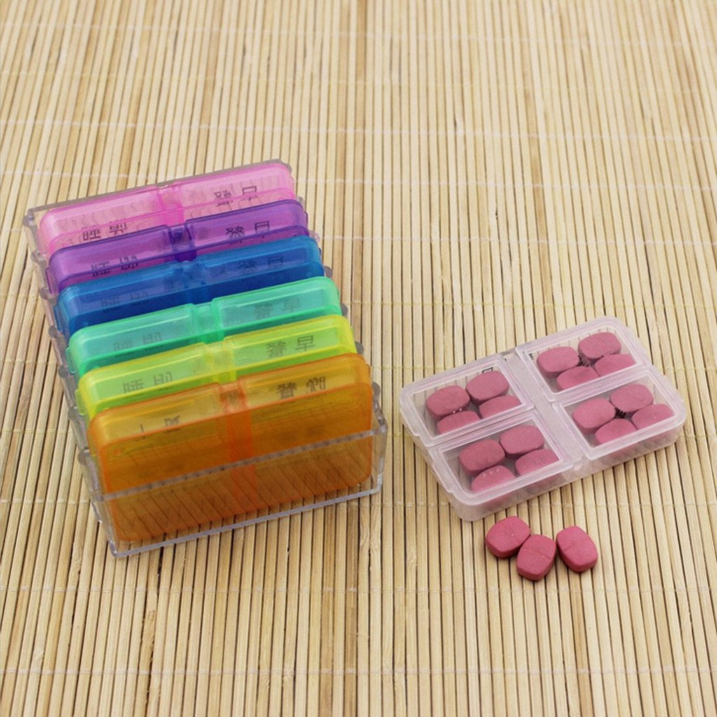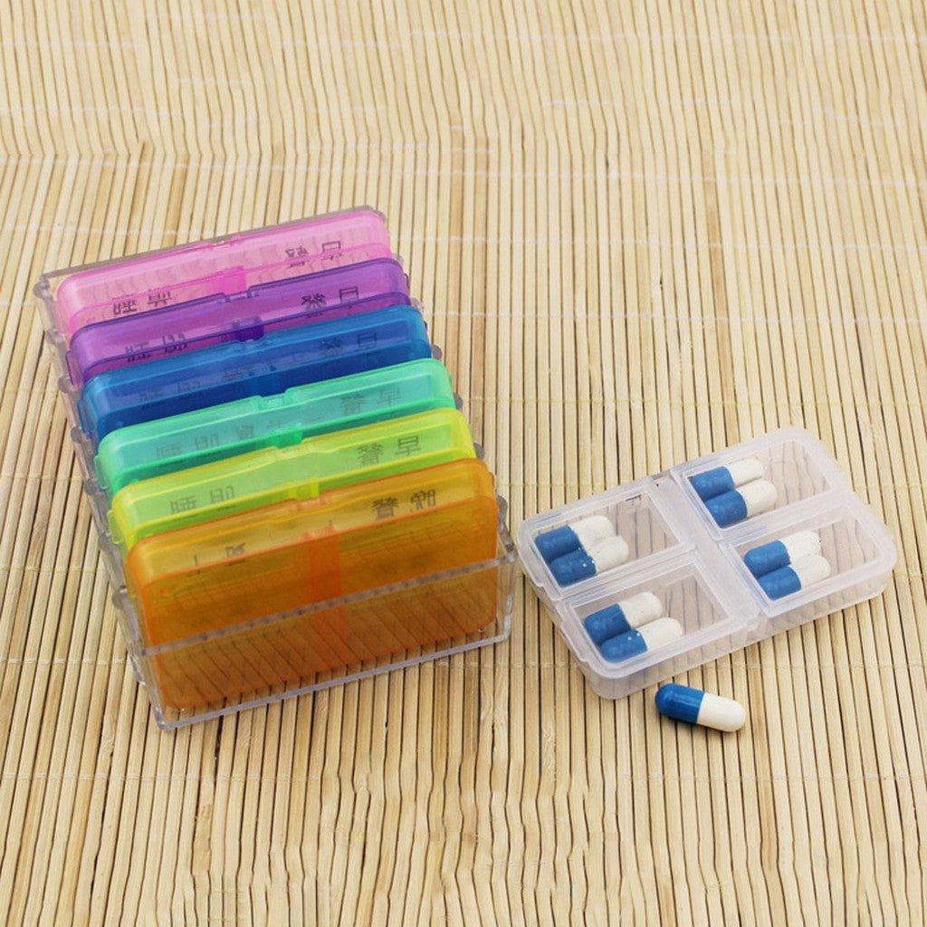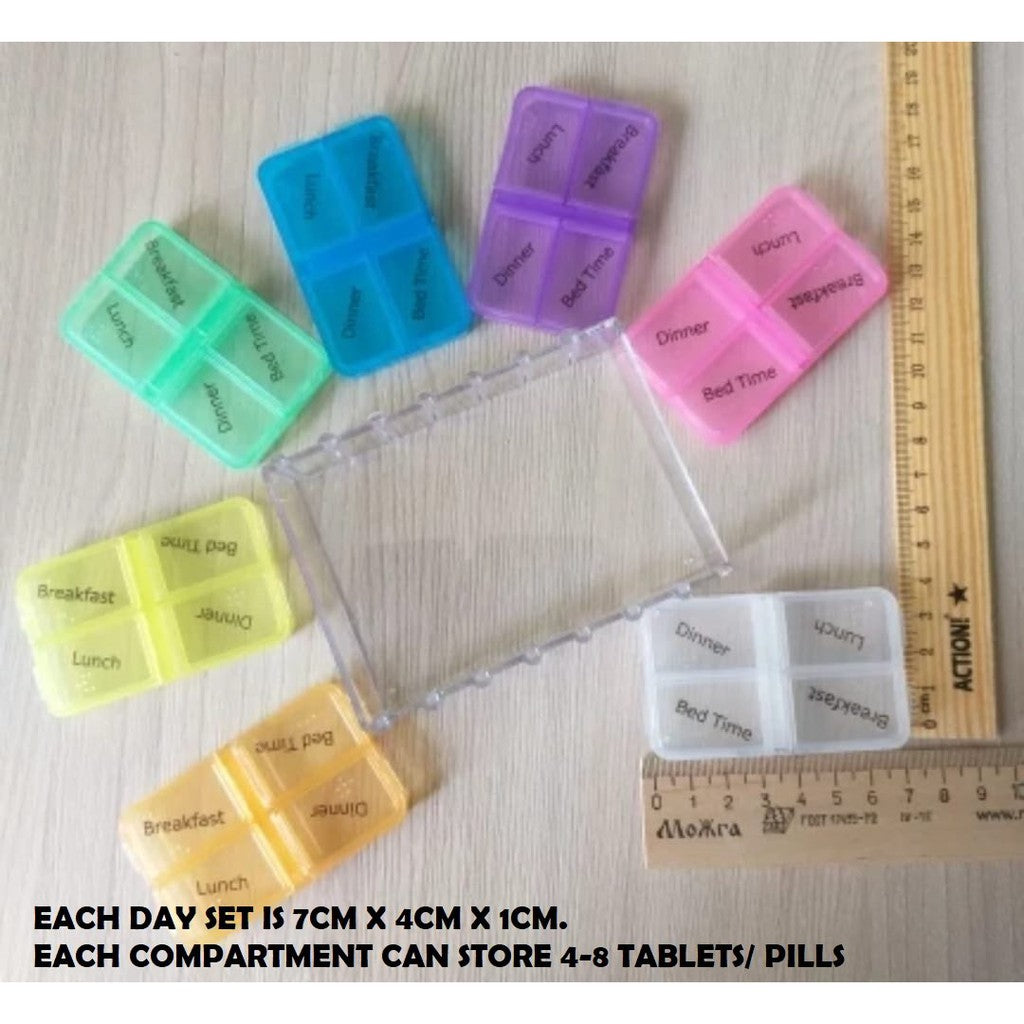 A simple yet handy pill organising tool to store one-week supplement or medication with 4 daily compartments.